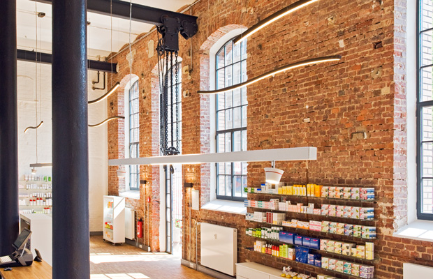 Die Malzböden Apotheke mit Sitz in dem historischen, denkmalgeschützten Fabrikgebäude der ehemaligen Brauerei Humbser erstrahlt in neuem Glanz. Die Historischen Malzböden Fürth wurden aufwändig und mit Liebe zum Detail zu einer modernen Immobilie saniert. Das betrifft auch das Lichtkonzept, welches wir für unseren Auftraggeber geplant und umsetzt haben.